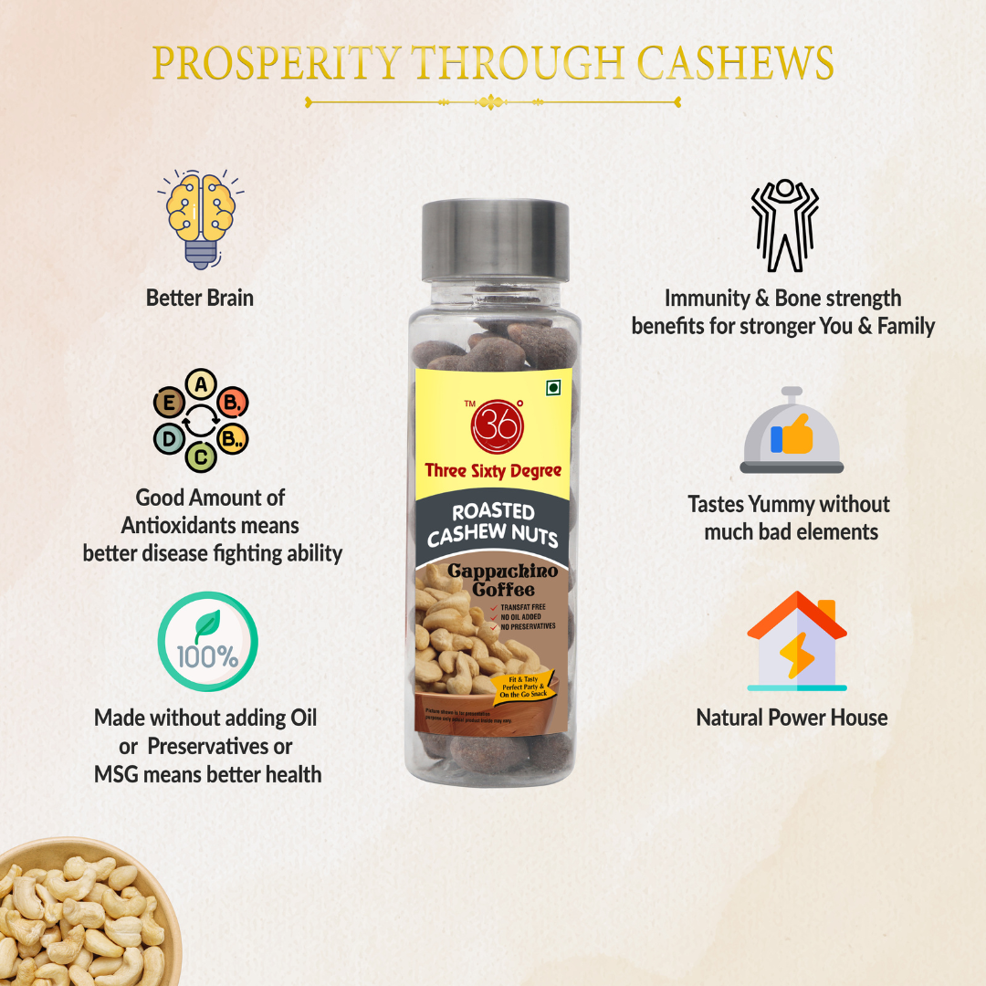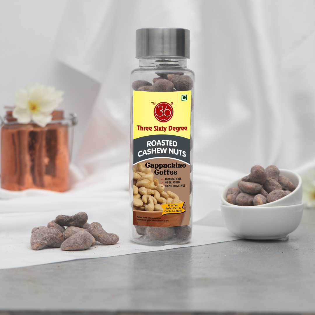 Caffeine meets crunch in a gourmet bite—Cappuccino Coffee Flavoured Oven Roasted Cashews in a PET jar serve up a bold fusion of smooth espresso and rich chocolatey notes. Each cashew is delicately roasted and coated with mocha magic, delivering a snack that’s energizing, indulgent, and perfectly packed for anytime pick-me-ups.