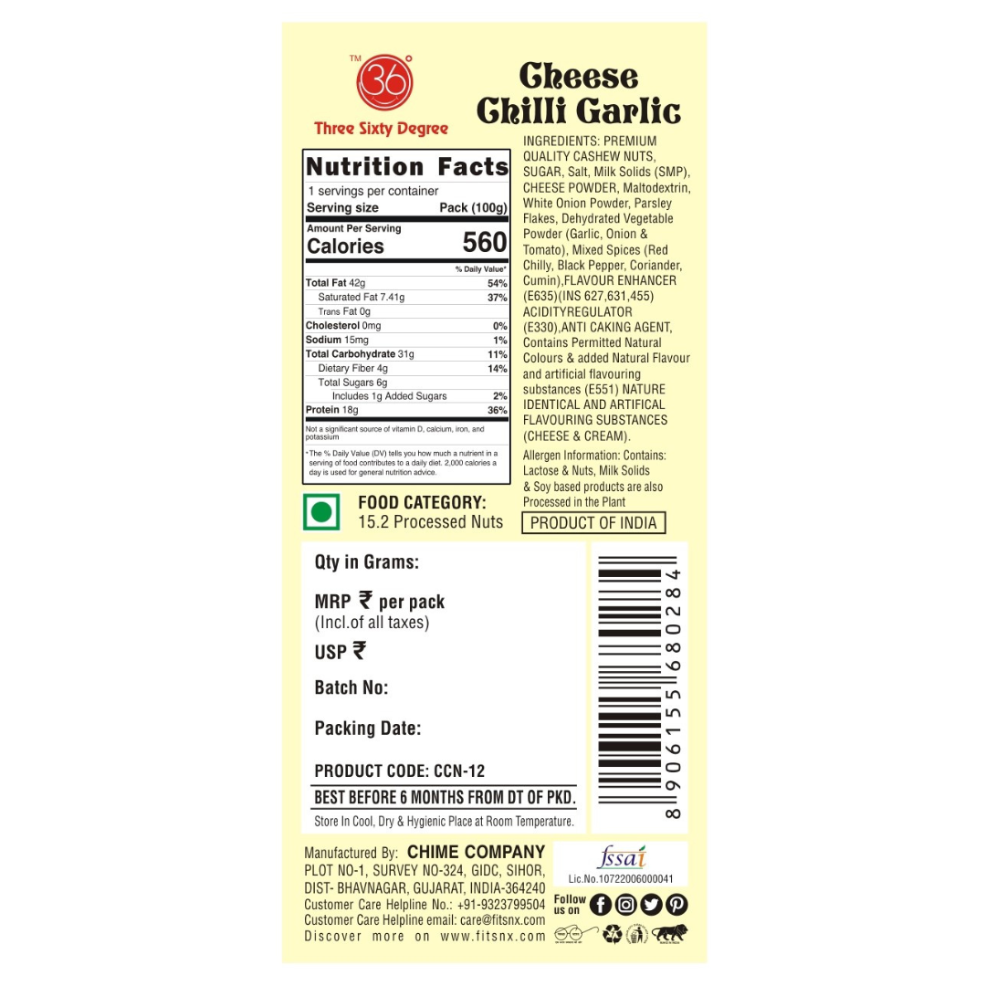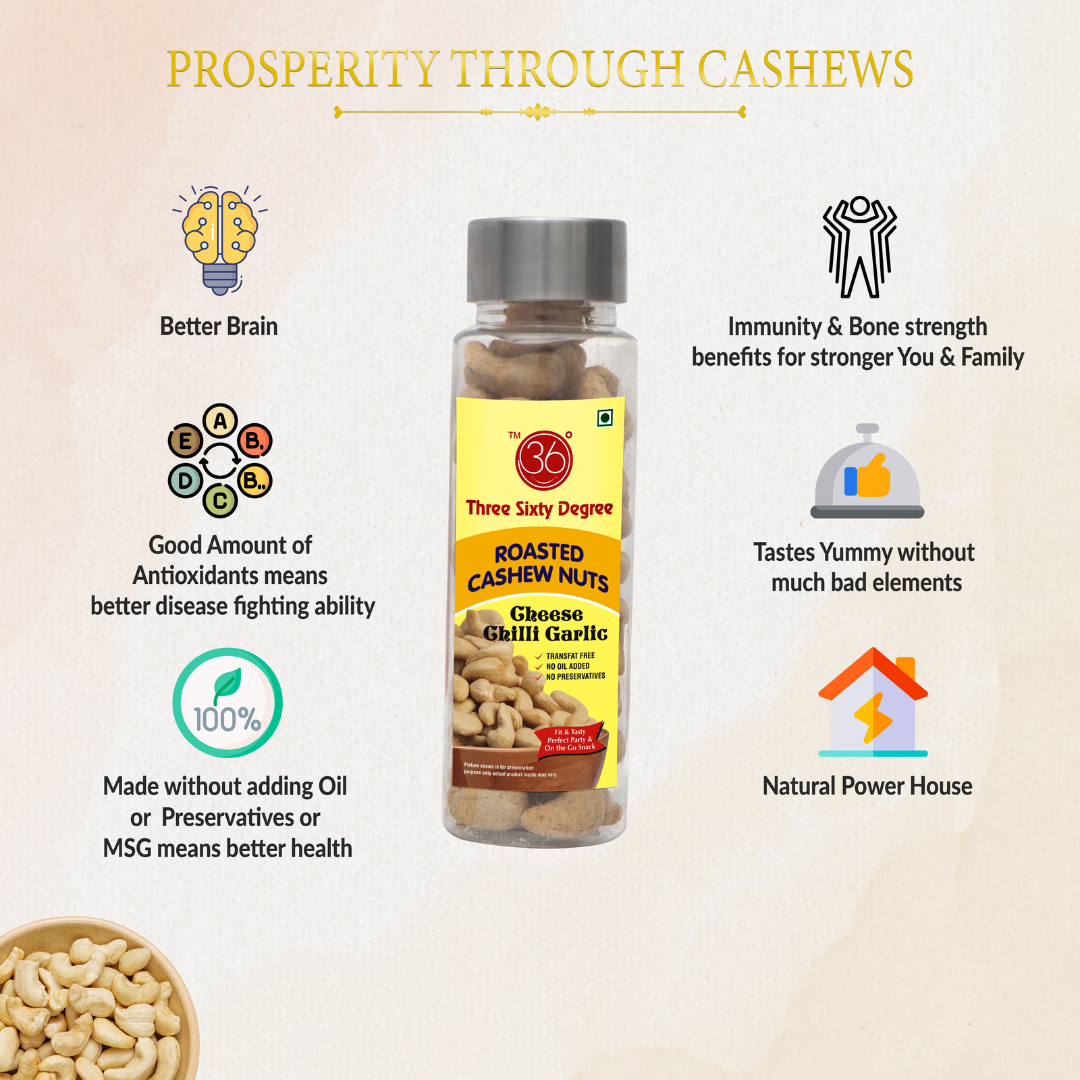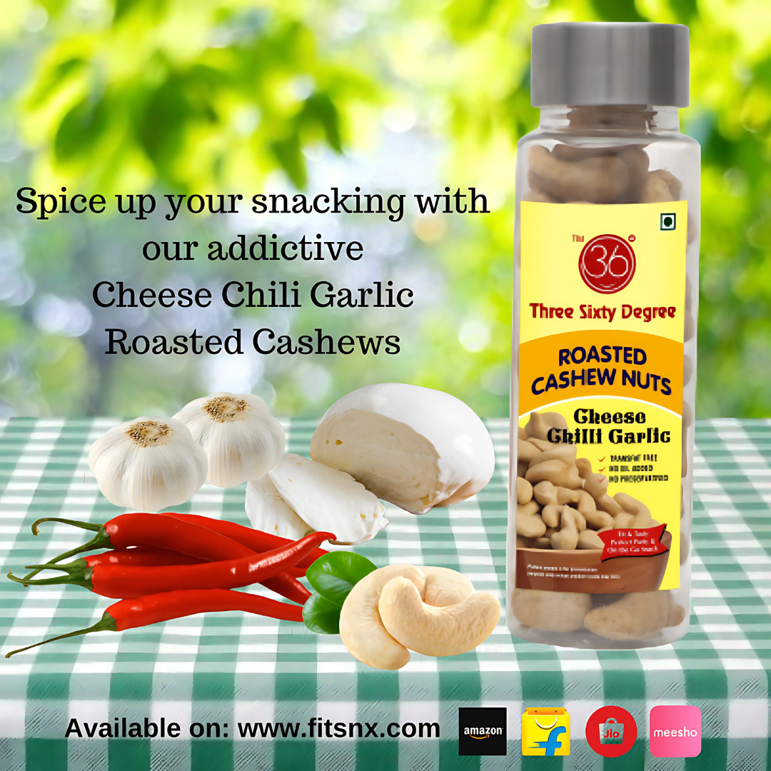 Triple-flavor knockout in every crunch—Cheese Chili Garlic Oven Roasted Cashews in a PET jar pack a bold fusion of creamy, spicy, and savory goodness. Each cashew is oven-roasted to golden perfection and coated in a rich blend of cheese, zesty chili, and aromatic garlic. It’s gourmet snacking with flavor that lingers and freshness that lasts.